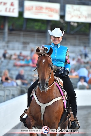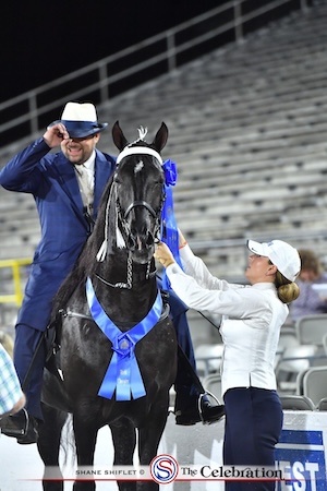 SHELBYVILLE, Tenn. – The first Thursday night of The Celebration is always full of promise as the Two-Year-Old Mare spilt and the Owner-Amateur Two-Year-Old split showcase the newest generation of great walking horses. The show got underway at precisely 7PM, with Mark Farrar welcoming White Diamond Dollar and Vicki Self into the show ring. Andy Keffer of First Church of the Nazarene gave the invocation, and James Wells of Franklin did a beautiful rendition of the national anthem. Sunny, mild weather brought with it the excitement for 14 competitive classes.