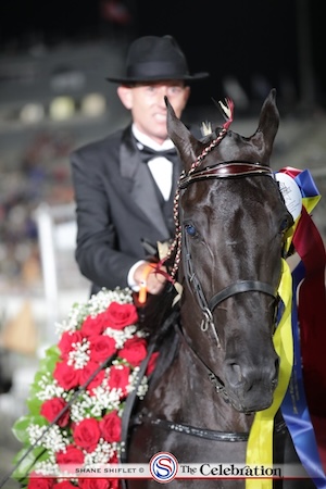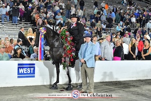 Class 200 ushered in the Owner-Amateur Four-Year-Olds. With Robert Cortner calling the class, 12 of 13 entries came down the hill and into the ring. Receiving the first-place tie, along with the tricolor ribbon and floral horseshoe, was Java with Nathan Oliver riding for The Dale Oliver Family of Bowling Green, Kentucky. This was Java’s first Celebration blue and it was a world grand championship ride. Java won at the Columbia Spring Jubilee and Let Freedom Ring shows earlier in the season and was sired by Master Of Jazz out of a Texas Joe Black mare. Second in the class, wearing the red and gold ribbon, was On Charlie Time and owner Greg Kiser of Rosedale, Virginia. On Charlie Time won this year at the ETWHA Ladies Auxiliary and Waynesville Charity show. Walking out of the lineup to a third-place finish was I’m Full Of Honor and Amy Ann Hurst for Mike McCormick and Amy Ann Hurst.