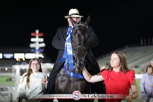 The last class of Wednesday night was also the last world championship preliminary of The 87th Celebration. From henceforth, there would only be world grand championship classes. Class 158 on the program was Walking Horses (Canter). The crowd cheered as seven entries came stepping down the hill and into the ring. Chris Bobo was the call judge. The Greatest Showman and Casey Wright took their first world champion ride as a team to the winner’s circle to wear the blue streamer and neck ribbon. The entry of Terry Lowman of Shelbyville, The Greatest Showman is sired by Walk Time Charlie. Ram Jam CTF and Charlie Green came next in the class. The entry of Dr. Steve Powers of South Pittsburg, Tennessee, Ram Jam CTF is sired by I Am Jose’. Finally walking to third was I’m Choobacca and Sam Martin, in the irons for Floyd and Caryl Sherman.